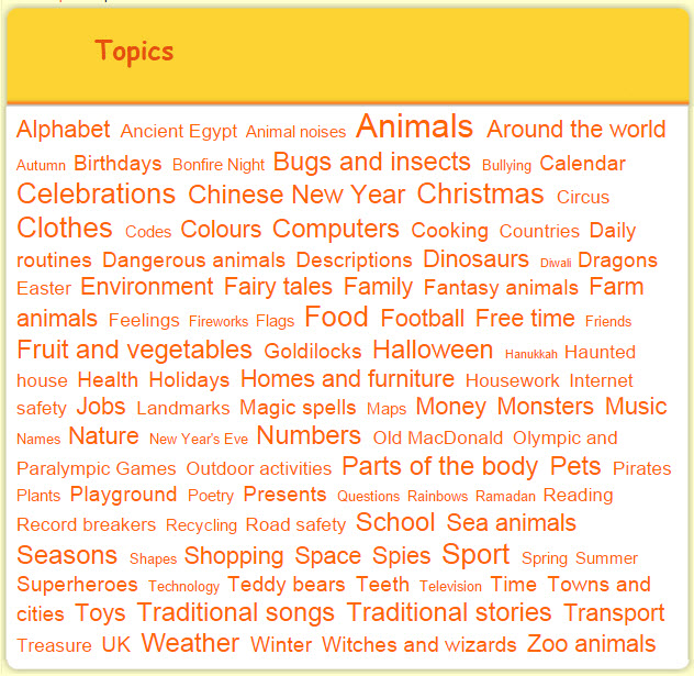 Have you seen our topics cloud? This is one of the easiest ways to find songs, stories, games and other activities on the topic you're looking for. Just click on the word!